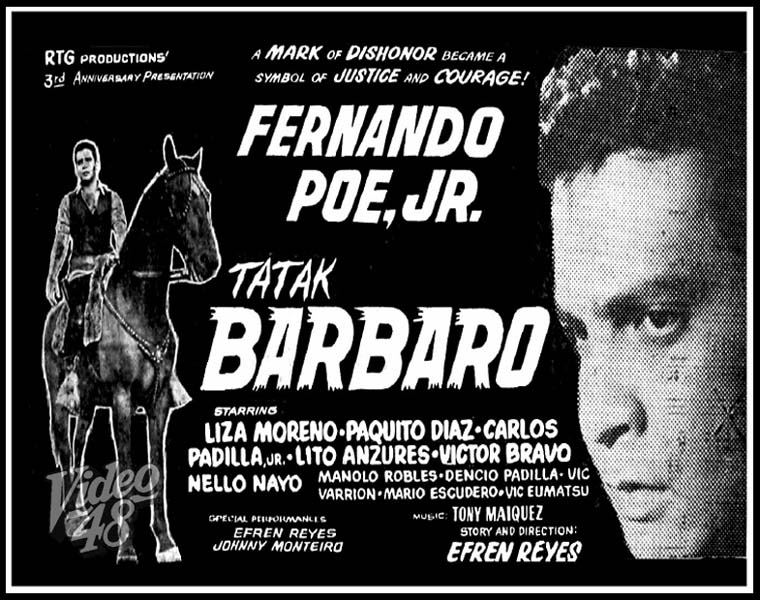 "Tatak Barbaro" (1965)- Stars Fernando Poe, Jr., Liza Moreno, Paquito Diaz, Carlos Padilla, Jr., Lito ANzures, Victor Bravo, Nello Nayo, Moanolo Robles, Dencio Padilla, Vic Varrion, Mario Escudero, Vic Eumatsu/ Directed by Efren Reyes